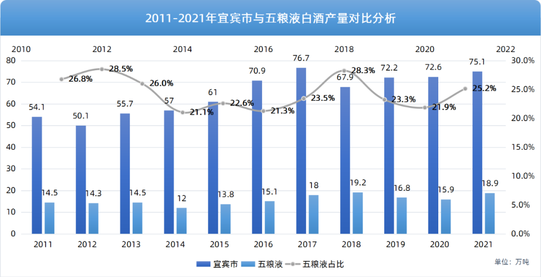 综合比较发现,五粮液白酒占宜宾市白酒产量基本稳定在25%左右。