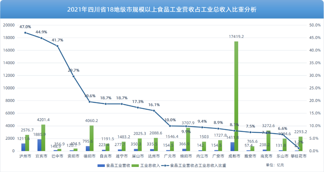 2021年四川省18地级市规模以上食品工业营收占工业总收入比重前三市域分别为泸州市、宜宾市、巴中市,其中泸州市规上食品营收所占比重为47%,位列第一位。宜宾市规上食品营收所占比重为44.9%,位列第二位。数据来源:各市统计年鉴 制图:食业园区研究院