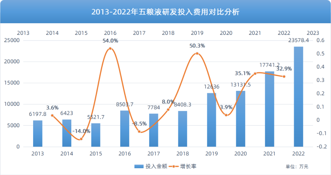 2013-2022年五粮液研发投入费用呈现波动式上升趋势,主要集中在“浓香型白酒特征风味物质的研究”“五粮液酿造专用粮研究”“固态浓香型白酒品质提升关键功能微生物技术开发”“五粮液窖内糟醅生酸调控技术研究”“智能化酿酒生产示范线开发及配套工艺研究”。2019年研发投入突破亿元大关,达到1.26亿元,增长率高达50.3%。