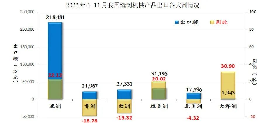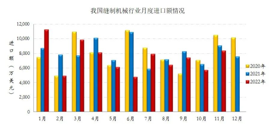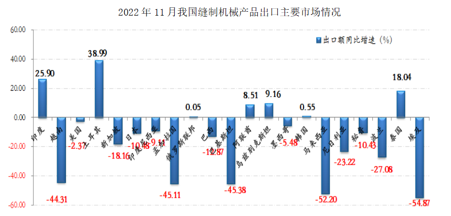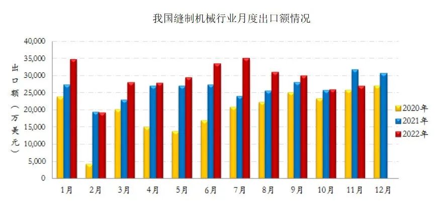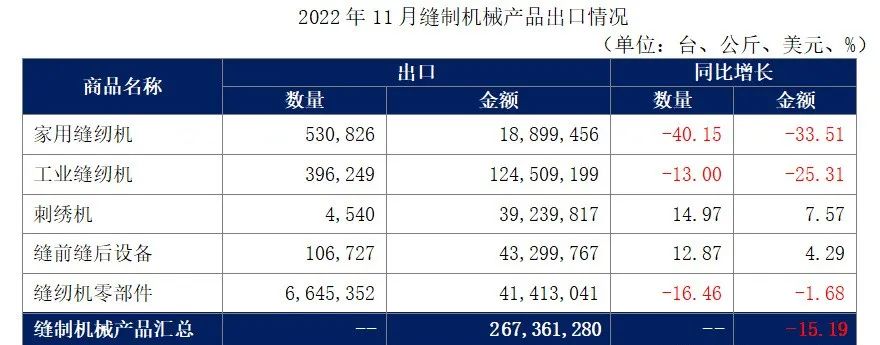 11月份,在疫情、通胀、地缘政治冲突以及货币政策趋紧等多重外部因素冲击下,欧美等发达国家消费和信心指数进一步下行,全球经济放缓趋势加快,海外鞋服等行业订单不足现象更趋明显。受此影响,我国缝制设备外需继续回落,出口额同比下降15.19%,环比增长3.76%,出口增速相较于三季度明显下滑。全年来看,行业出口形势总体稳中有增,亮点突出,韧性凸显。