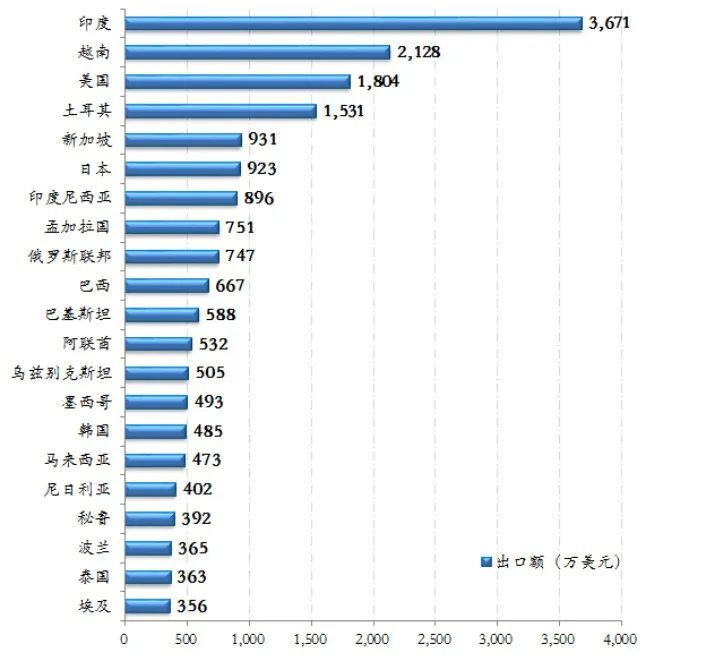 前11月,我国对亚洲、拉美、大洋洲市场出口同比增长,而对欧洲、非洲、北美洲出口均呈同比下滑态势。各区域市场中,我国对“一带一路”市场出口额达21.35亿美元,同比增长20.14%,占行业出口额比重高达67.02%,比重较上年同期增长4.48个百分点;对RECP市场出口额达10.45亿美元,同比增长16.40%,占行业出口额比重32.81%,比重较上年同期增长1.21个百分点;对东盟市场出口8.71亿美元,同比增长21.15%;对南亚市场出口7.21亿美元,同比增长32.41%;对西亚市场出口2.96亿美元,同比增长34.62%;对欧盟市场出口1.68亿美元,同比下降26.91%;对东亚市场出口1.57亿美元,同比下降5.48%;对中亚市场出口0.85亿美元,同比增长10.87%。