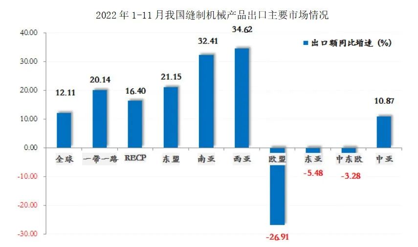 具体分国别来看,前11月我国缝制机械产品出口200个国家与地区中,其中近六成市场出口额同比均呈现不同程度的增长态势,前20大出口市场中,15个市场出口额呈现增长态势,其中增幅超两位数的12个,超30%的6个。