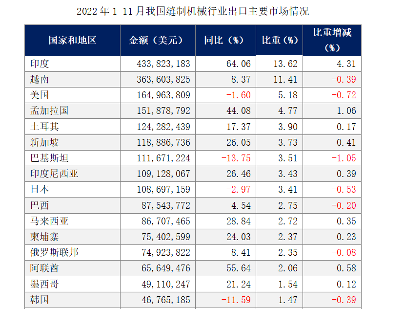 11月当月我国对东盟出口5660万美元,同比下降33.08%,环比下降5.80%;对印度出口3671万美元,同比增长25.90%,环比下降15.42%;对越南出口2128万美元,同比下降44.31%,环比下降14.29%(已连续6个月环比负增长);此外,11月我国对土耳其、阿联酋、乌兹别克斯坦、泰国等主要市场缝制机械出口额同比均呈现增长态势;而对美国、新加坡、日本、印度尼西亚、孟加拉国、俄罗斯、巴西、巴基斯坦等市场出口均呈现同比下滑态势。