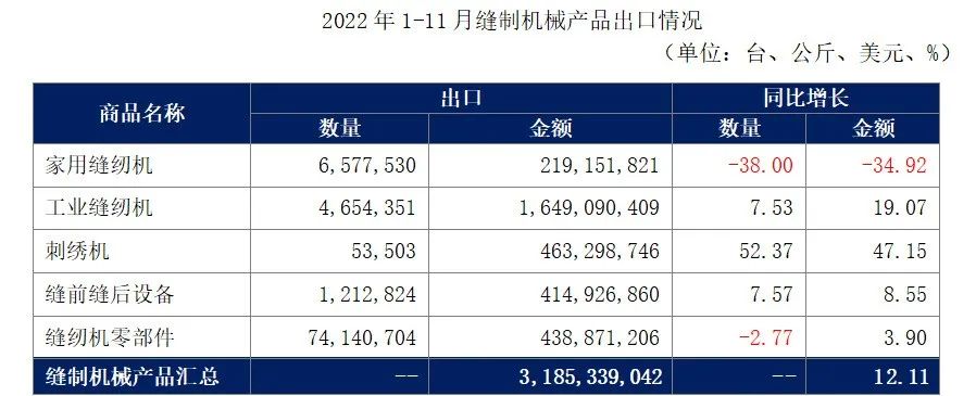 据海关总署数据显示(文中所有数据均来源于海关总署):1-11月我国缝制机械产品累计出口额31.85亿美元,同比增长12.11%,增幅较上月进一步收窄。其中,工业缝纫机出口量465万台,出口额16.49亿美元,依然处于同期出口高位,同比分别增长7.53%和19.07%。刺绣机出口量5.4万台,出口额4.63亿美元,同比分别增长52.37%和47.15%。