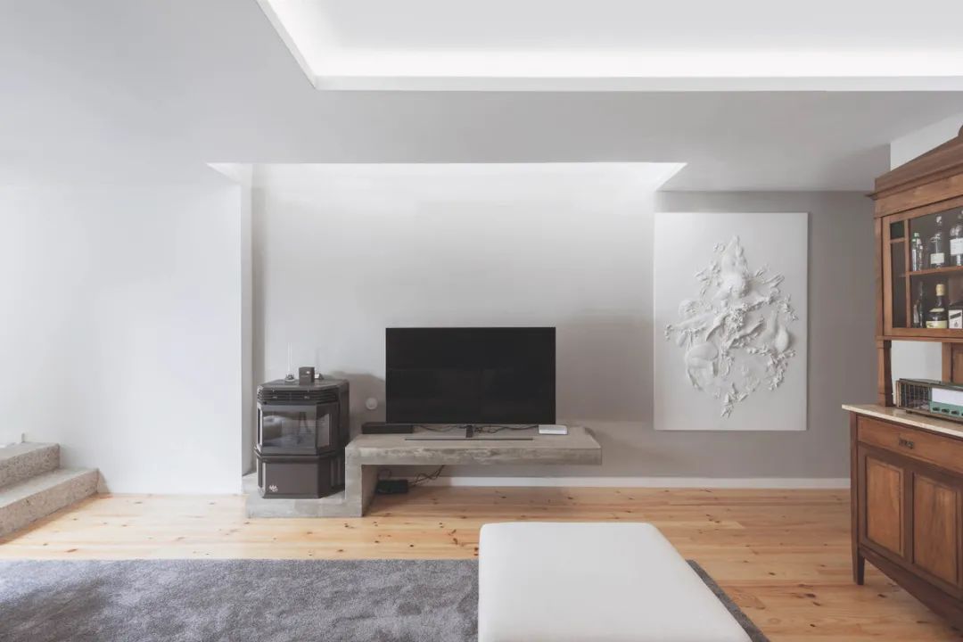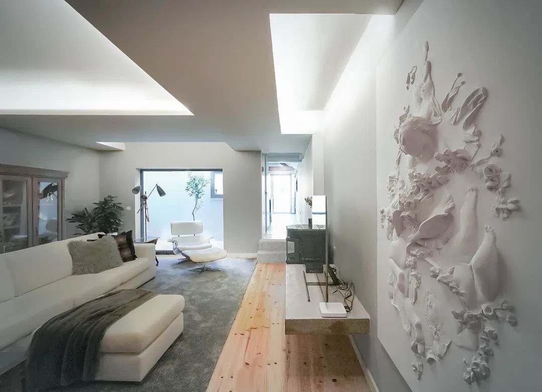 客厅通过pátio接收自然光,通过墙壁反射均匀,为其目的创造最佳条件,放松和阅读。