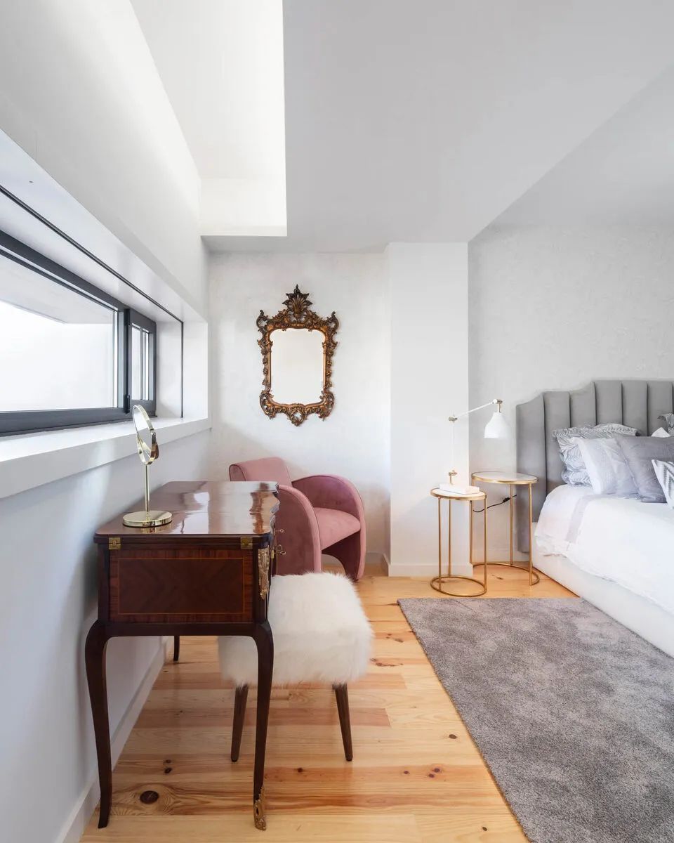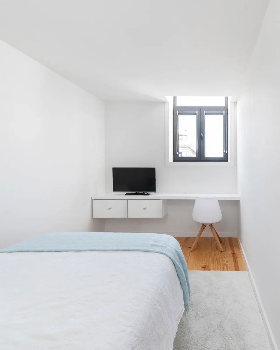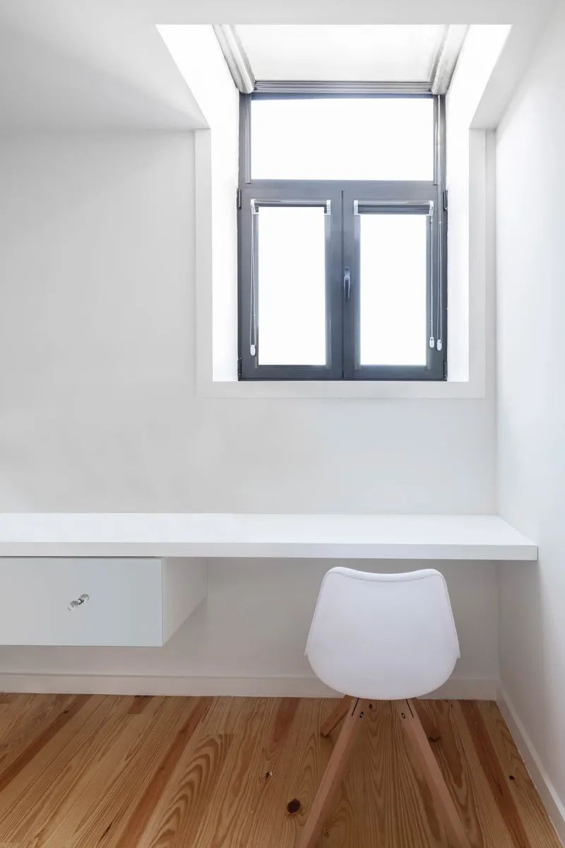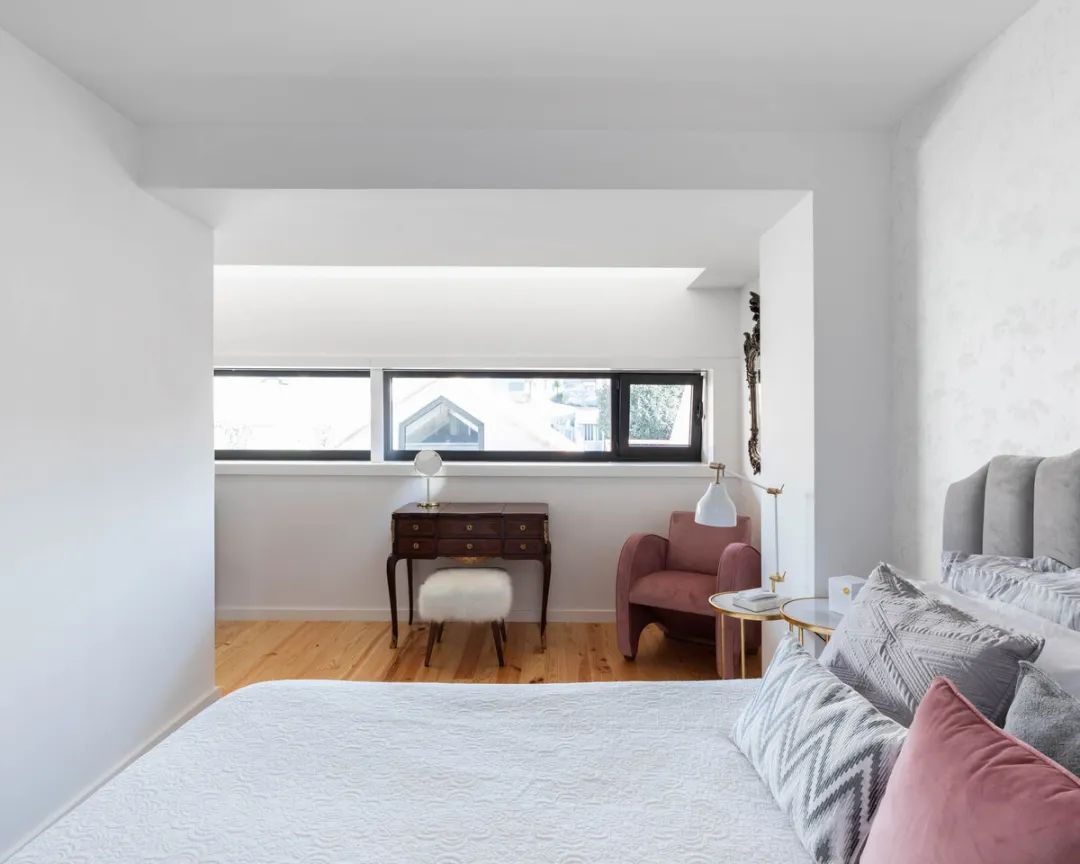 套房,一扇水平的窗户贯穿整个房间,光线均匀,花园景色宜人。