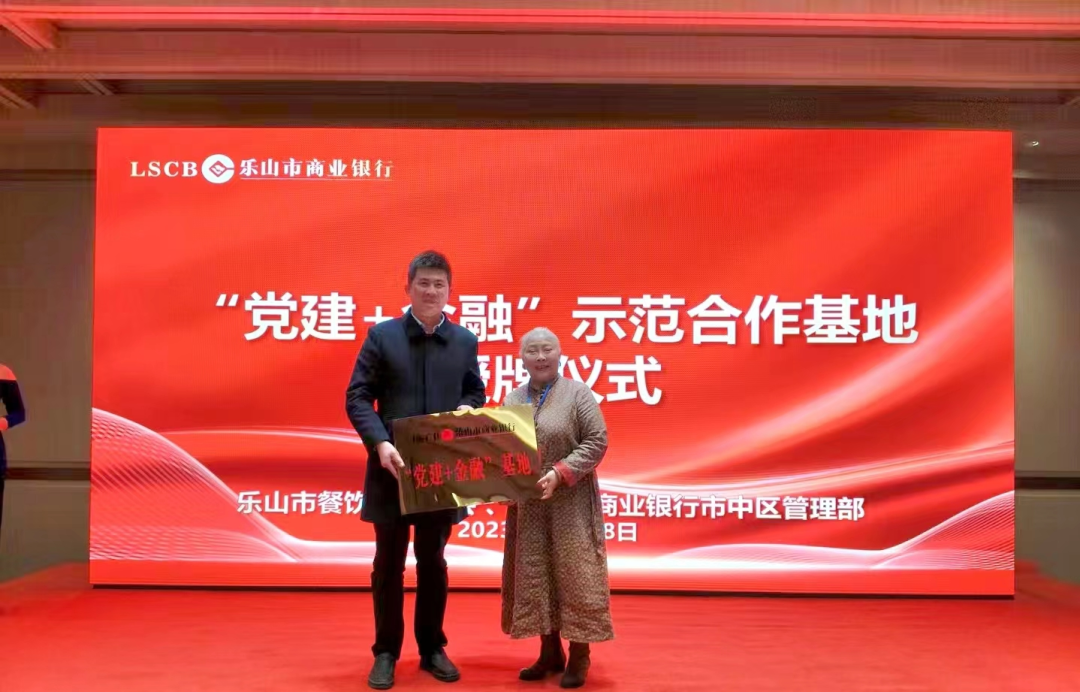 总结会前,协会会长龚芬和乐山市商业银行市中区管理部副总经理刘杰共同为乐山市餐饮行业协会与乐山市商业银行市中区管理部打造“党建+金融”示范合作基地揭牌。