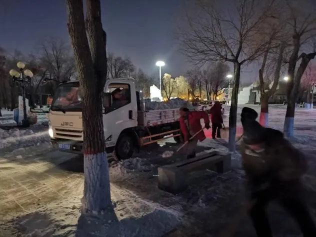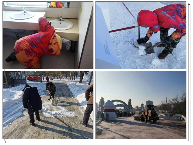 加班加点抢进度 早7时前全部到岗,为抢在试开园前完成园区道路两侧整饰工作,试开园的前一天,加班到天完全黑透,工人们顶着零下近30度的严寒,终于完成了试开园前的最后一轮铺雪、修型工作。确保当天园内环境卫生始终保持干净整洁。