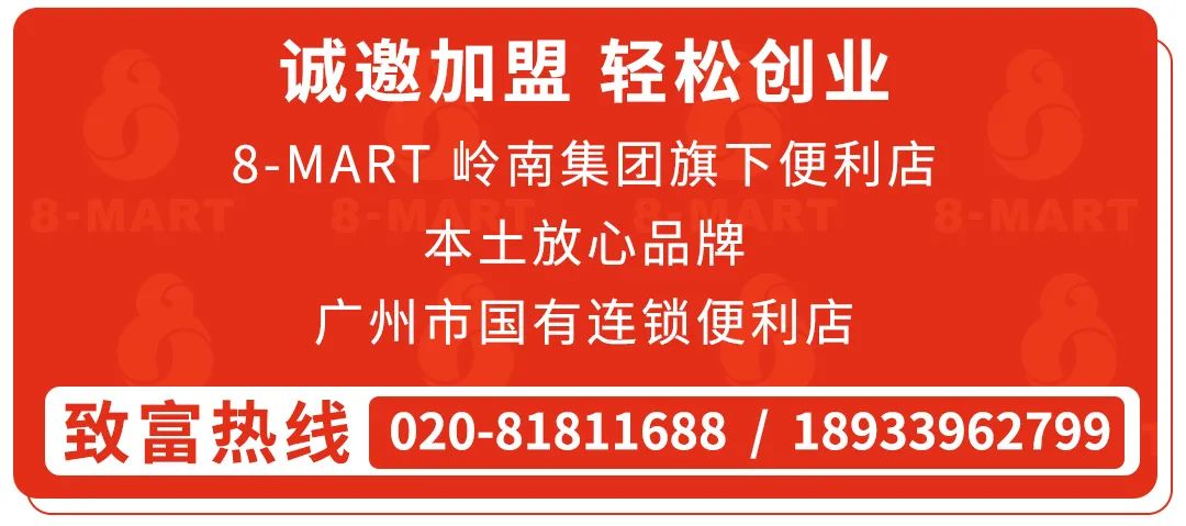 8字便利店是岭南集团旗下品牌连锁便利店,拥有先进的经营理念、统一的品牌形象、成熟的“便利店+互联网”、连锁零售运营管理模式,网点遍布广州中心商务区和大型居民区,并持续拓展布点,为市民提供安全、放心、便捷、特色的多元商品和服务,是您身边的品质生活好伙伴,成功创业好平台。