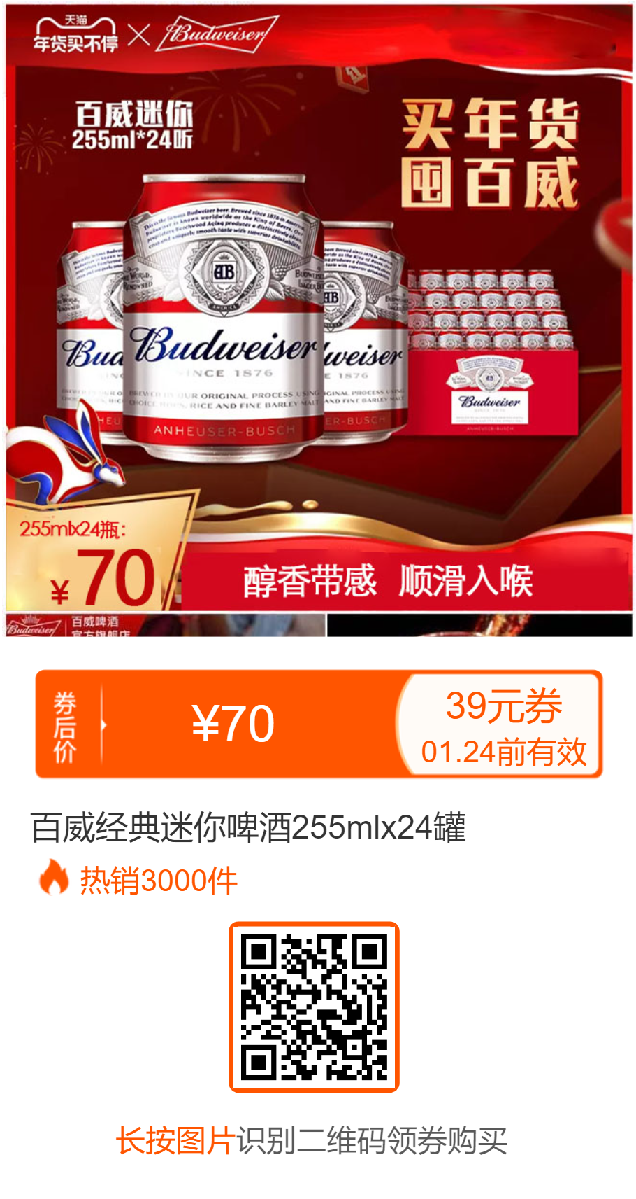 【天猫直发】百威经典迷你啤酒255mlx24罐