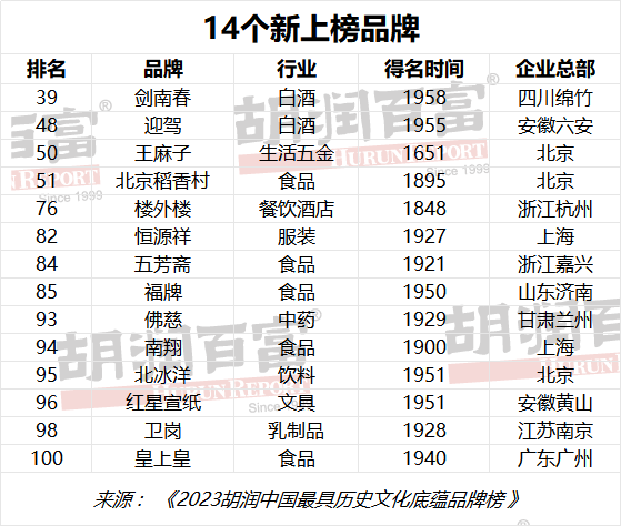 胡润百富董事长兼首席调研官胡润表示:“这是我们第四年发布中国最成功的60岁以上品牌榜,我们今年继续在商务部中华老字号名单进行筛选,并结合企业自主申报、行业研究,找到接近300个候选品牌,从品牌历史、价值和文化内涵三个维度打分,选出综合得分最高的前100名。今年上榜企业中,出现14个新品牌,包括一些大家耳熟能详的品牌,如剑南春、恒源祥、北冰洋等。”