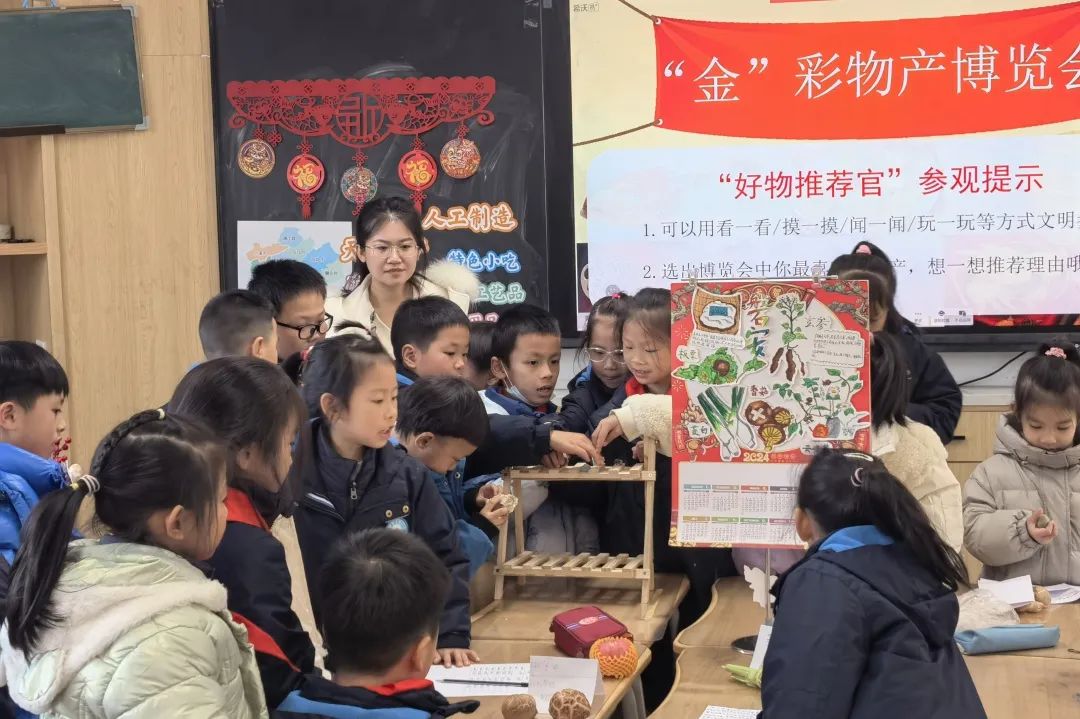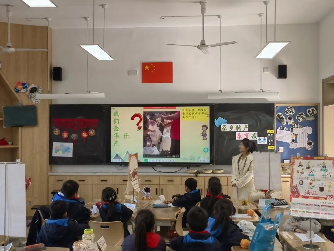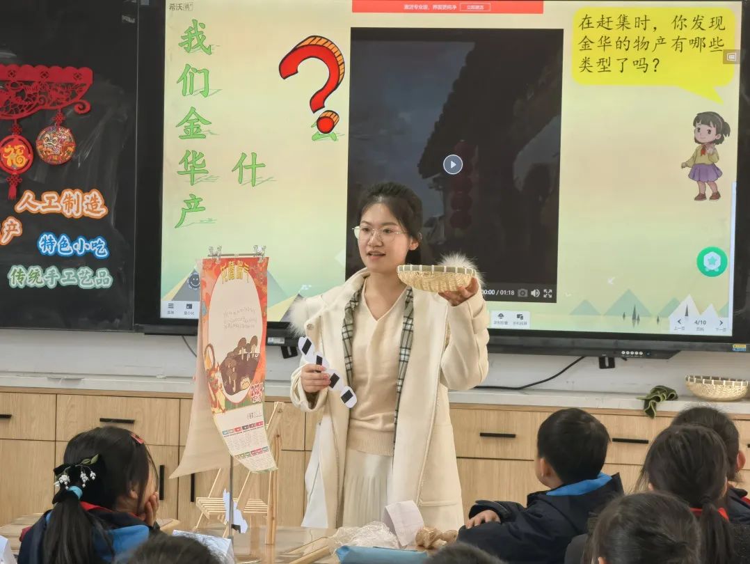 课堂中,童嘉老师以金华站首棒火炬手孟关良的采访实录为话题,激发学生兴趣,聚焦金华物产。引导学生走入真实生活情境,以“我们金华产什么”“‘金’彩物产推介会”“‘金’彩物产博览会”“我是好物推荐官”“我是民间稻艺家”等系列活动,助力学生加强对“家乡物产”的认识。