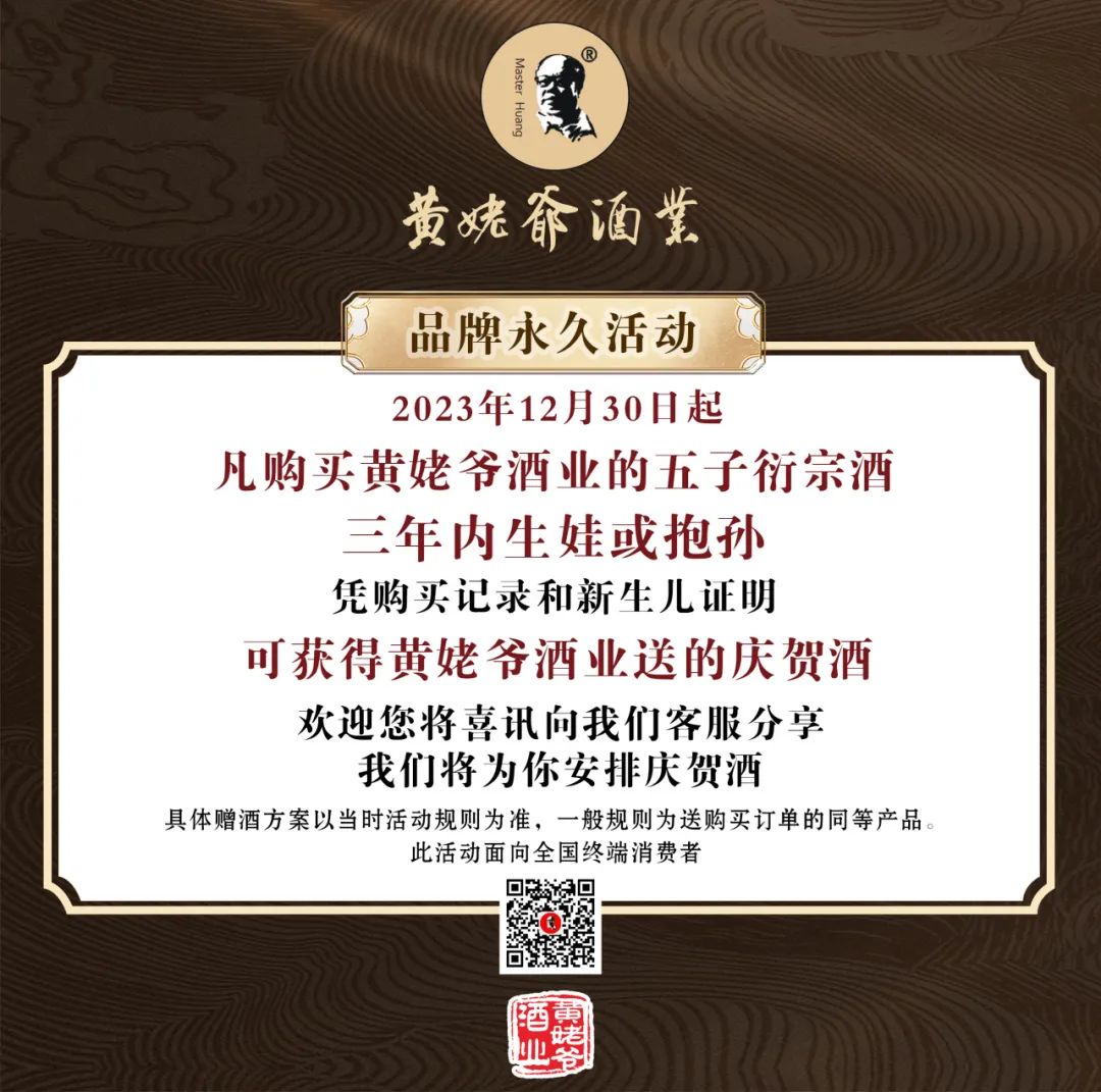 自2023年12月30日起,凡购买黄姥爷酒业的五子衍宗酒,三年内生娃抱孙的客户,凭购买记录及新生儿证明,均可获得黄姥爷酒业送出的庆贺酒!