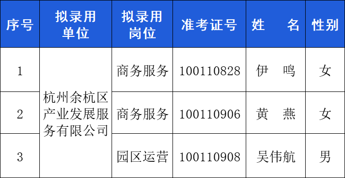根据《关于进一步规范杭州市余杭区国有企业员工管理的实施意见(试行)》(余组〔2021〕4号)和《2023年下半年杭州市余杭区公开招聘区属国有企业工作人员公告》,经过公开报名、资格审查、初试、笔试、综合考核、资格复审、考察、体检等程序,经研究,拟录用下列人员为杭州余杭区产业发展服务有限公司员工,现予以公示如下: