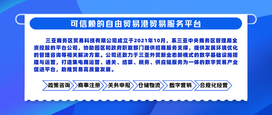 海南自由贸易港三亚跨境电商服务中心为三亚商务区贸易科技有限公司运营的服务载体,始终秉承“专业为本,真诚服务”的宗旨,立足于海南自由贸易港跨境电商发展,辐射全球,为更多来海南投资的跨境电商企业提供全方位一站式服务。