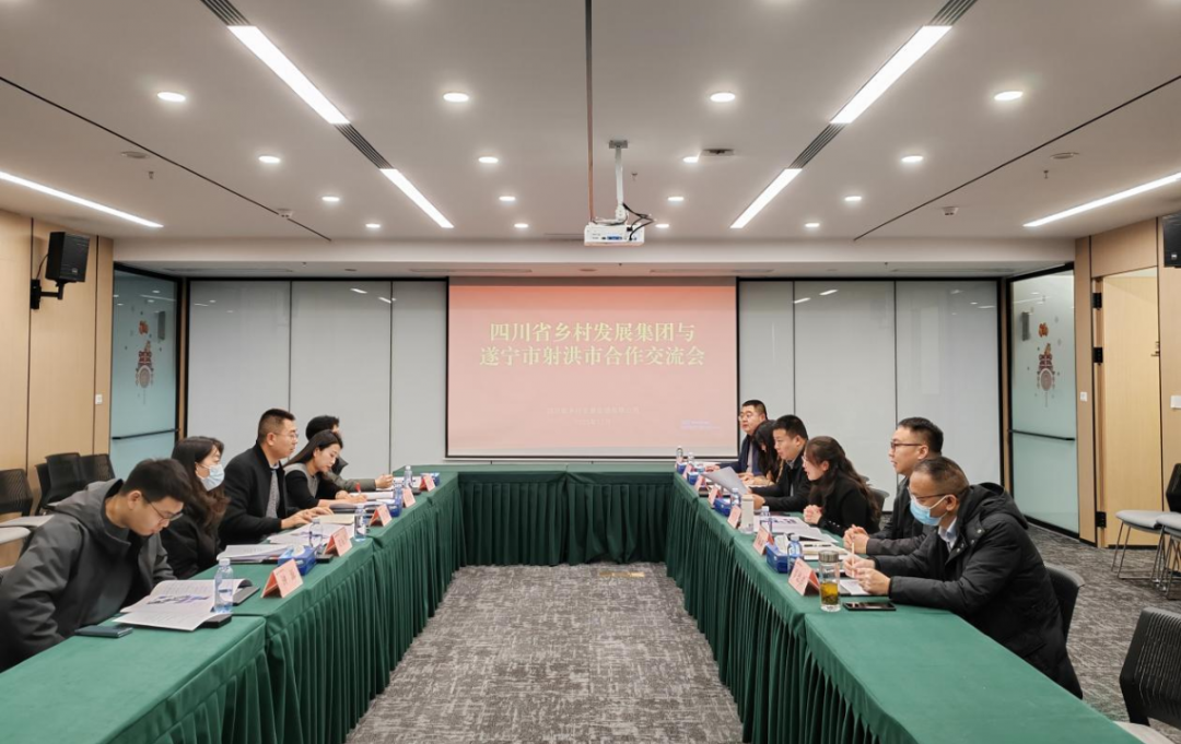 在四川天府粮仓农业开发有限公司会议室,双方召开了四川省乡村发展集团与遂宁市射洪市合作交流会。会上遂宁市农业农村局、射洪市农业农村局分别向省乡村发展集团推荐遂宁市、射洪市名优农产品,双方一致同意由市农投公司组织射洪名优农产品,利用省乡村发展集团经销渠道优势,将更多遂宁市、射洪市优质农产品投入川内连锁商超和中央厨房。在与会领导的见证下,四川天府粮仓农业开发有限公司与市农投公司签订了合作协议,双方将各自发挥优势形成互补,在酒粮基地核心区建设等方面开展更为广泛的合作,为打造新时代更高水平的“天府粮仓”贡献力量。