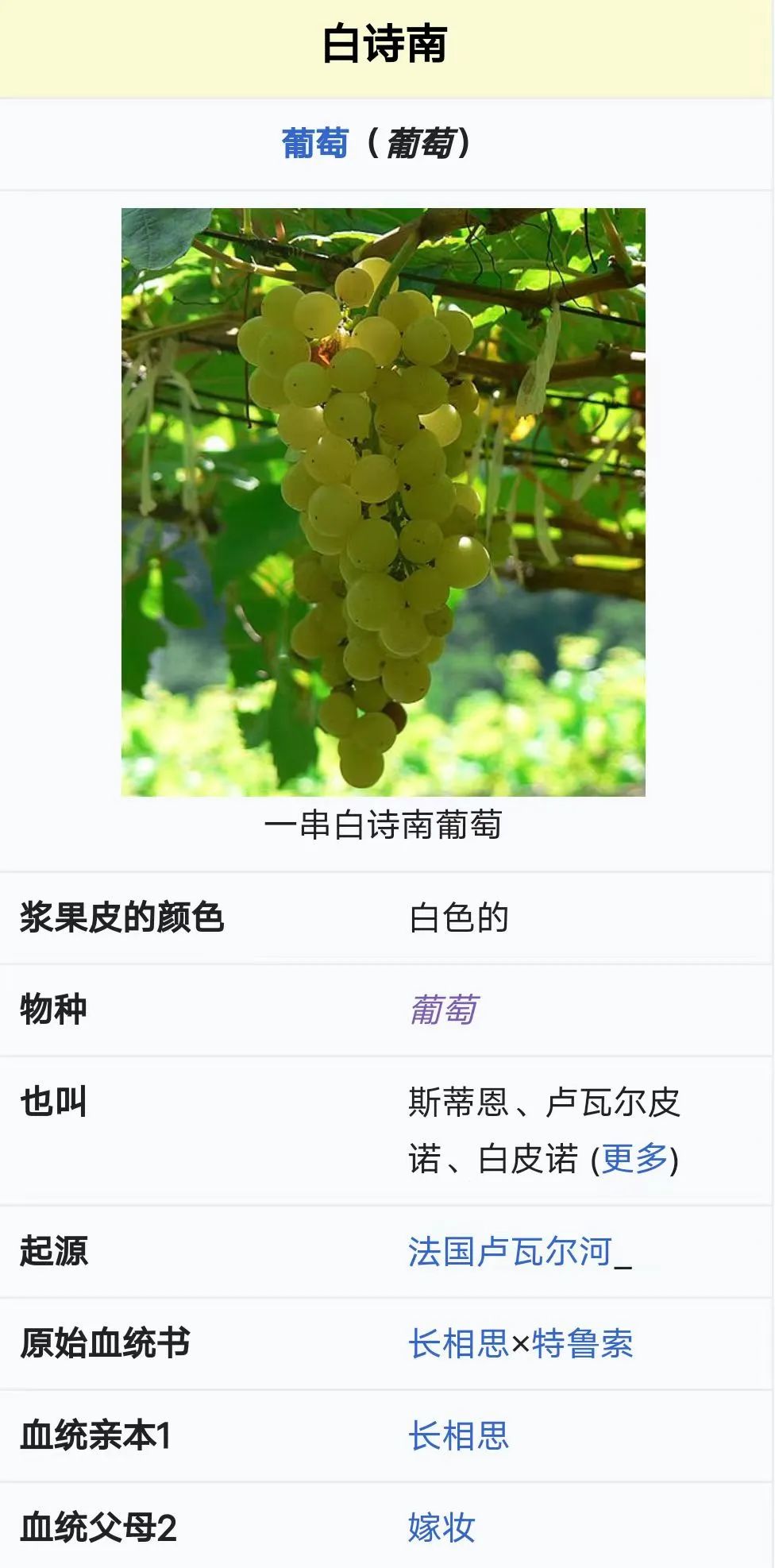 白诗南(Chenin blanc) (也被称为Pineau de la Loire )是一种产自法国卢瓦尔河谷的白葡萄 品种。在卢瓦尔河谷以外的大部分新世界葡萄酒产区都可以找到它的身影。它是南非种植最广泛的品种,历史上也被称为Steen。这种葡萄可能是Jan van Riebeeck于 1655 年在南非种植的第一批葡萄之一,或者它可能是在1685 年南特法令被撤销后随着胡格诺派教徒逃离法国而来到南非的。在南非,白诗南是种植最广泛的品种,占21世纪初所有葡萄园种植面积的近五分之一(18.6%)。2008年,该葡萄种植面积达18,852公顷(46,580英亩),几乎是法国白诗南种植面积的两倍。所以,白诗南酿造的葡萄酒,对于南非来说,可以说得上是国宝级的葡萄酒。