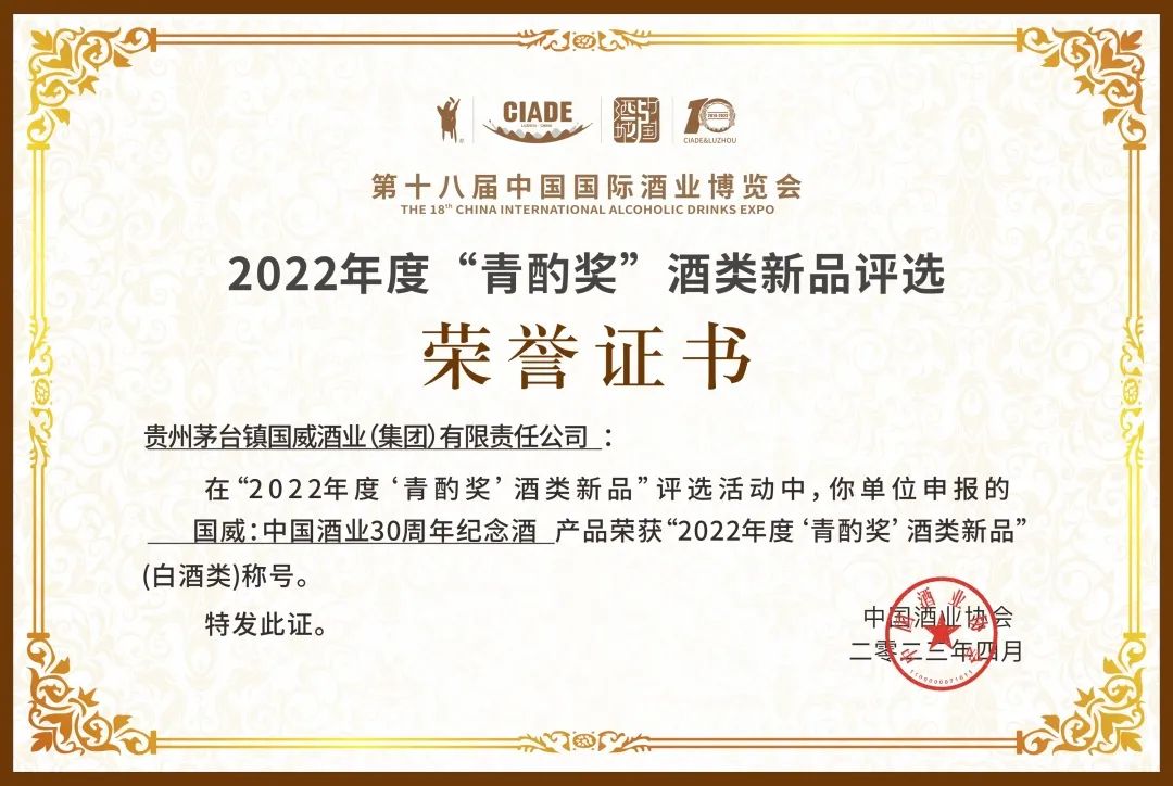 2023年4月,在2022年度酒类新品颁奖盛典上,国威酒业荣获中国酒业最高荣誉 “青酌奖”。并于同月,再收获中国酱香白酒核心产区(仁怀)酱酒包装设计优秀奖。