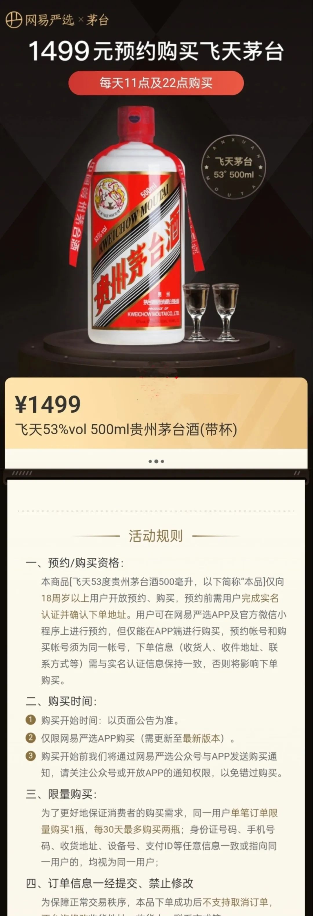 小程序预约购买,仅限网易严选APP,单笔订单限购一瓶,每30天最多购买两瓶,身份证号码,手机号码,收货地址,设备号,支付ID等任意信息一致或指向同一用户的,均视为同一用户。购买时间:每天11点及22点购买