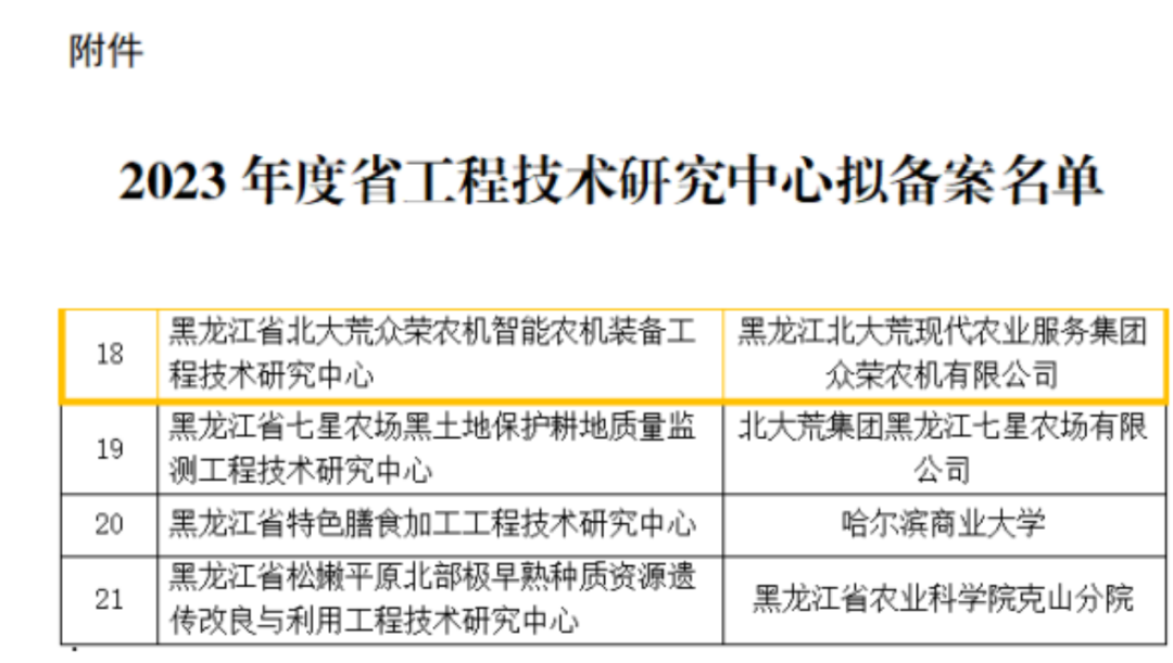 据悉,本次获得2023年度省级工程技术中心荣誉,是农服集团众荣农机公司在农服集团党委的坚强领导下,组建成立的高端智能农机装备研发中心,该工程技术研究中心主推垦征品牌,是依托北大荒的先进技术、公司自身国家级高新技术企业和省级专精特新企业能力设立的科技型企业研发机构。本中心秉承农服集团“利他”理念,坚持以企业为主体、市场为导向、产学研深度融合的技术创新体系为重要载体,充分为北大荒集团大型大马力智能农机装备先导区建设赋能增效,为中国粮食装满中国饭碗贡献北大荒智能农机装备力量。