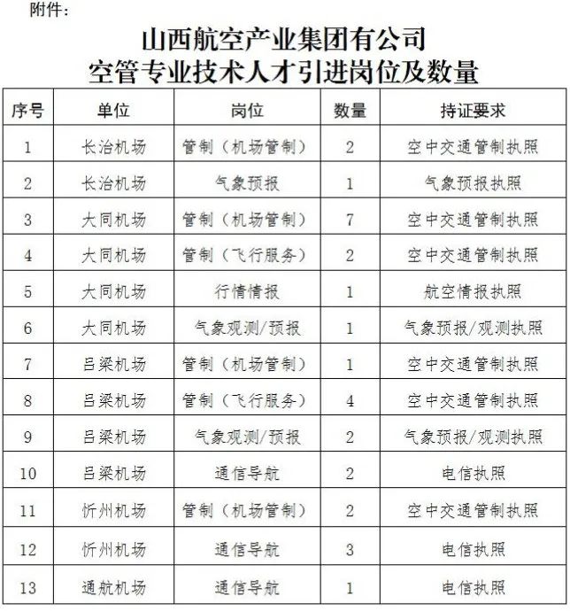 下游产业、通用航空、临空经济为关联业务的航空产业投资管理集团,主要包括集团总部、机场板块、通航板块和非航业务板块。根据工作需要,通过“特殊紧缺高层次人才”通道,面向社会公开引进管制、气象、通导、情报专业技术人才29人。1.遵纪守法,作风正派,品质良好,责任心强,具有团队合作精神;2.认同航产集团企业文化、业务发展方向及管理模式,遵守航产集团各项规章制度;集团公司所辖各机场管制、气象、通导、情报岗位,需持有民航局颁发的注册有效期内的专业执照。具体岗位与数量见附件。在山西省国有资本运营有限公司网站(http://www.ssco.ltd)、山西航空产业集团有限公司网站(http://www.sxairport.org.cn)发布引才信息。应聘者登录报名系统进行报名(登录地址:http://59.49.35.2:9015/recruit#/portal_job_list?job_class=social),并按要求上传相关材料。根据专业知识与技能、素质与能力、品德与价值观、岗位匹配度等维度对报名人员进行面试,择优引进。对拟引进人员进行体检和背景调查,持有民航3A体检合格证的可不参与体检。办理入职手续,新入职人员与各应聘单位签订劳动合同。(一)报名人员须按照要求,诚信参与各个环节,严禁弄虚作假。资格审查贯穿引才工作全过程,对于弄虚作假、违规违纪的,取消应聘资格,对进入体检、公示环节后无故放弃的人员,记入航产集团公开招聘诚信库。扫码查看附件及更多公告