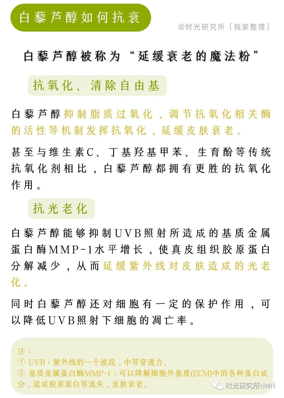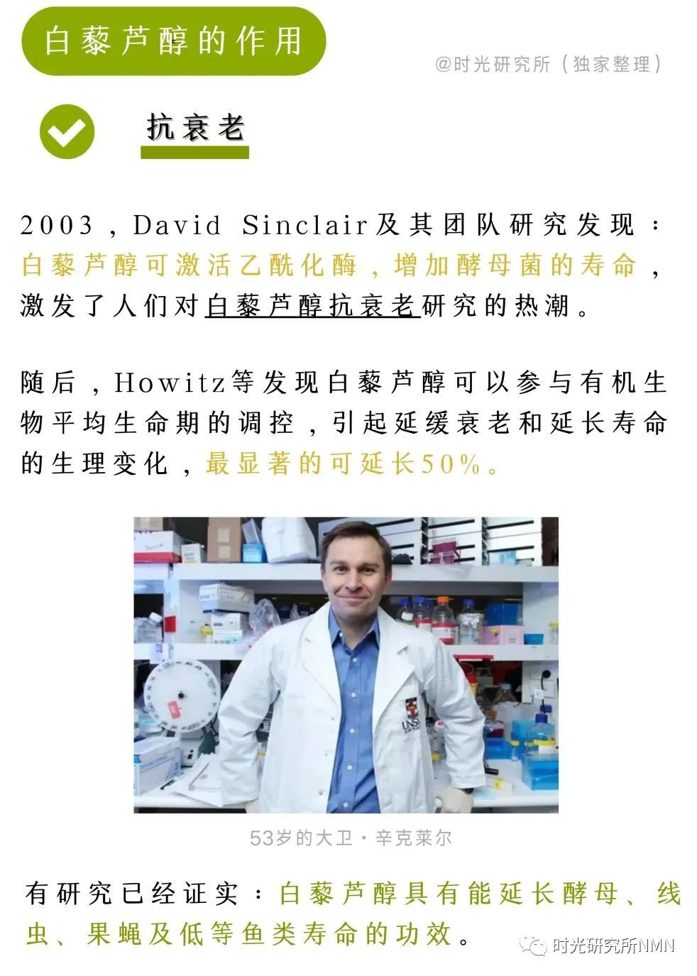 通过深入研究,哈佛教授David Sinclair发现它具有惊人的功效:不仅还具备美容、抗炎和抗癌的特性,还能够延长寿命达到50%,让人焕发年轻活力。