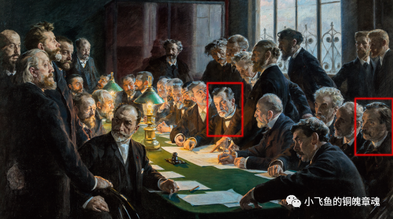 当时欧洲艺术中心其实是在法国,所以与会者有大批法国大拿,其中就有章牌大师沙普兰。财大气粗的卡尔·雅各布森索性把这批法国人组织起来,成立了一个“法国艺术研究委员会”,自任会长,并由画家克罗耶创作了一幅名为《1888年哥本哈根法国艺术研究委员会》的油画,画中的卡尔·雅各布森和沙普兰我都圈起来了。