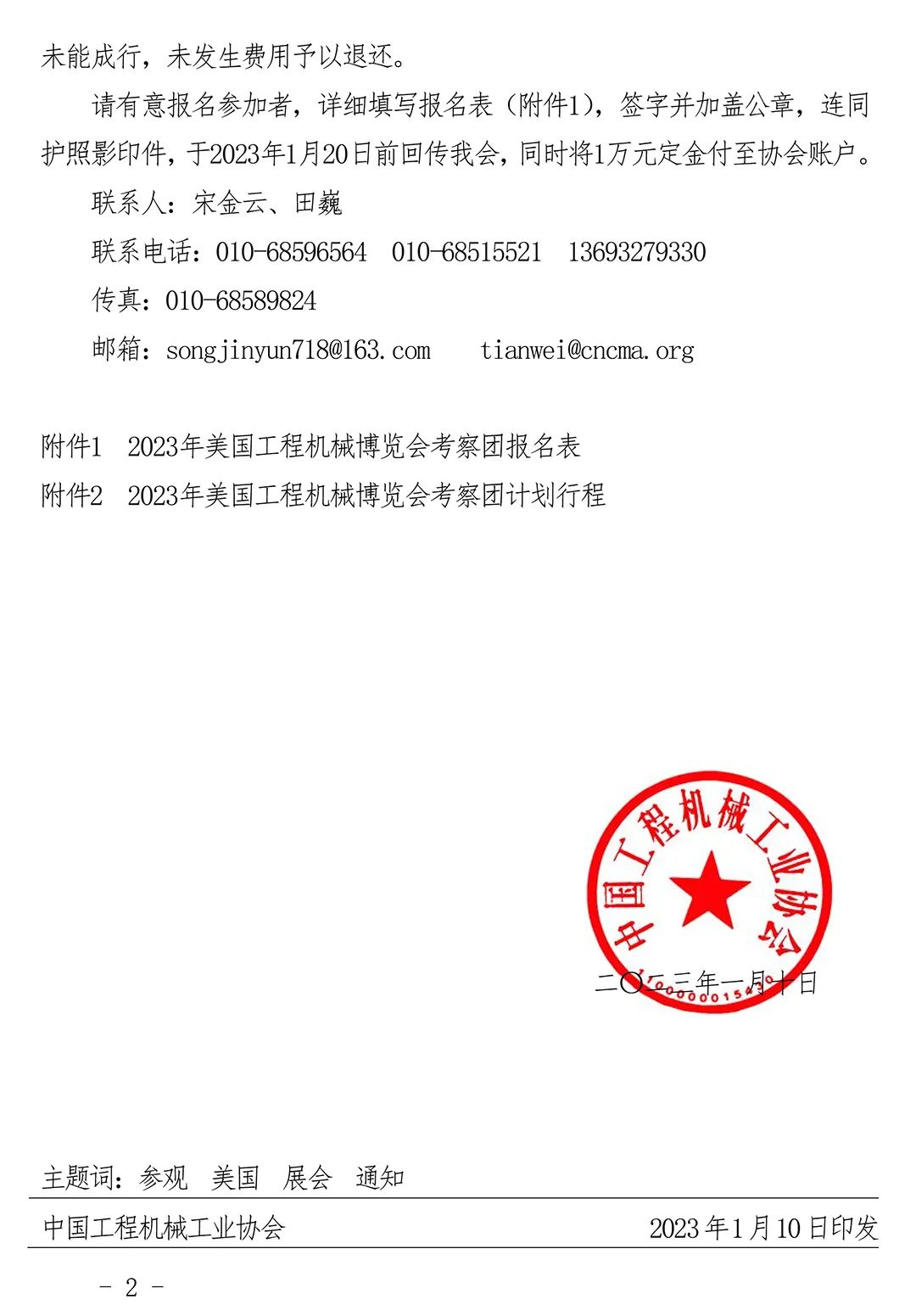 请有意报名参加者,详细填写报名表(附件1),签字并加盖公章,连同护照影印件,于2023年1月20日前回传我会,同时将1万元定金付至协会账户。