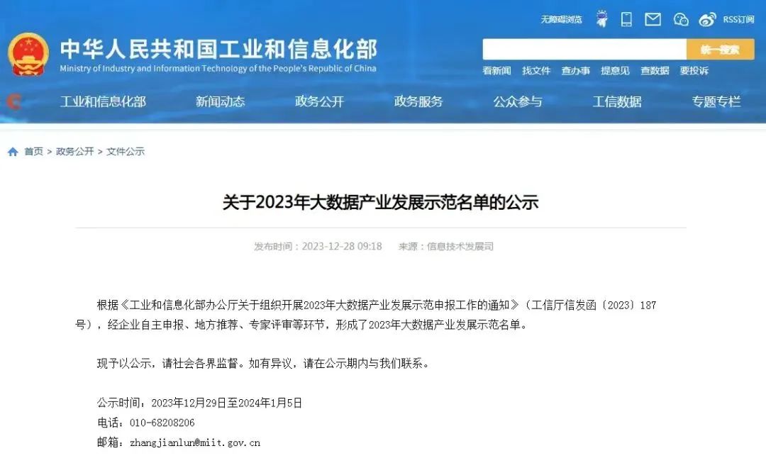 12月28日,工业和信息化部发布了《关于2023年大数据产业发展示范名单的公示》。根据《工业和信息化部办公厅关于组织开展2023年大数据产业发展示范申报工作的通知》(工信厅信发函〔2023〕187号),经企业自主申报、地方推荐、专家评审等环节,形成了2023年大数据产业发展示范名单。