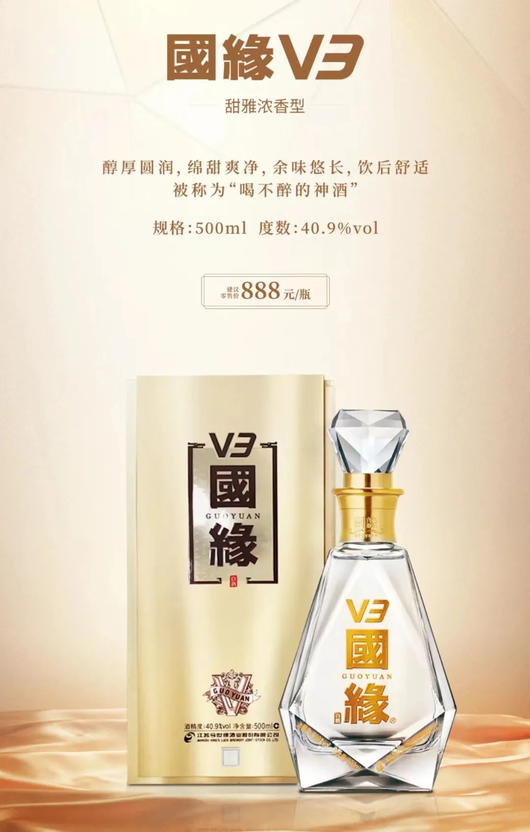 陈年老酒,越陈越香。国缘V3经过长期贮存,酒体中极性分子充分缔合,醇、酸、酯等各种有益微量成分协调平衡。因此,与传统浓香型白酒相比,国缘V3具有“酒体更清澈更透明,气味更芳香更纯正,入口更绵雅更醇净,口感更细腻更浑厚,饮后更舒适更飘逸”的独特风格。