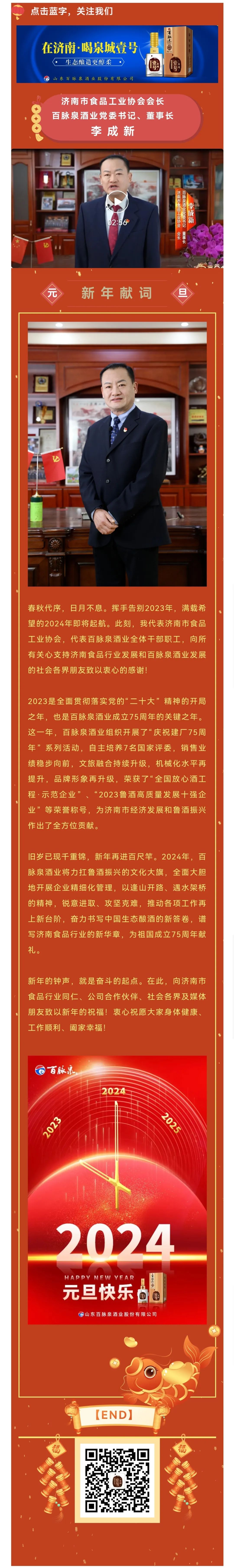 济南市食品工业协会会长,百脉泉酒业党委书记、董事长李成新恭祝全国人民新年快乐!