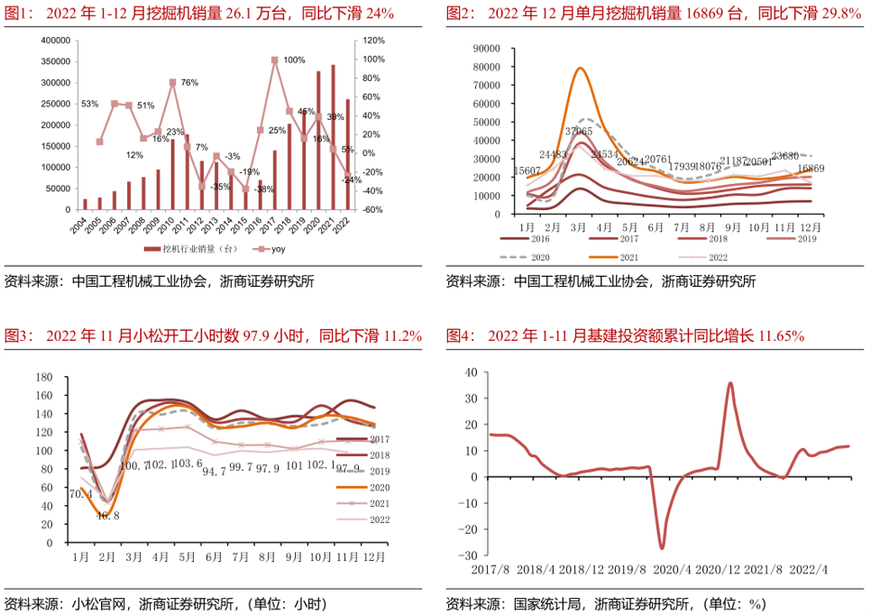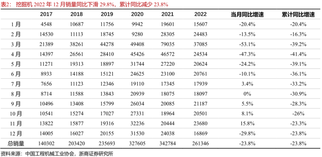 事件:据中国工程机械工业协会对26家挖掘机制造企业统计,2022年12月销售各类挖掘机16869台,其中国内6151台,出口10718台。 |