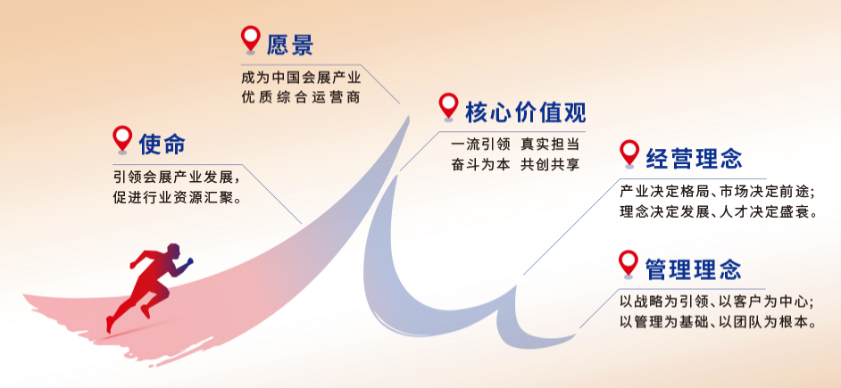 我们以初心育匠心,以匠心守初心,以“引领会展产业发展,促进行业资源汇聚”为使命,以成为“中国会展产业优质综合运营商”为愿景,砥砺深耕“场馆建设与运营管理、展会经营与商务服务”两大赛道,不断开拓创新。