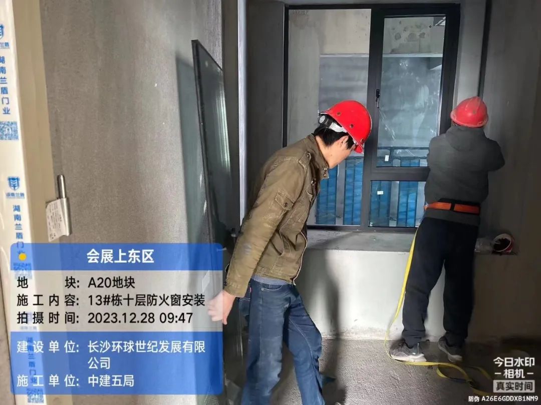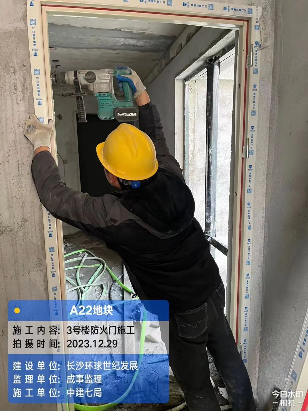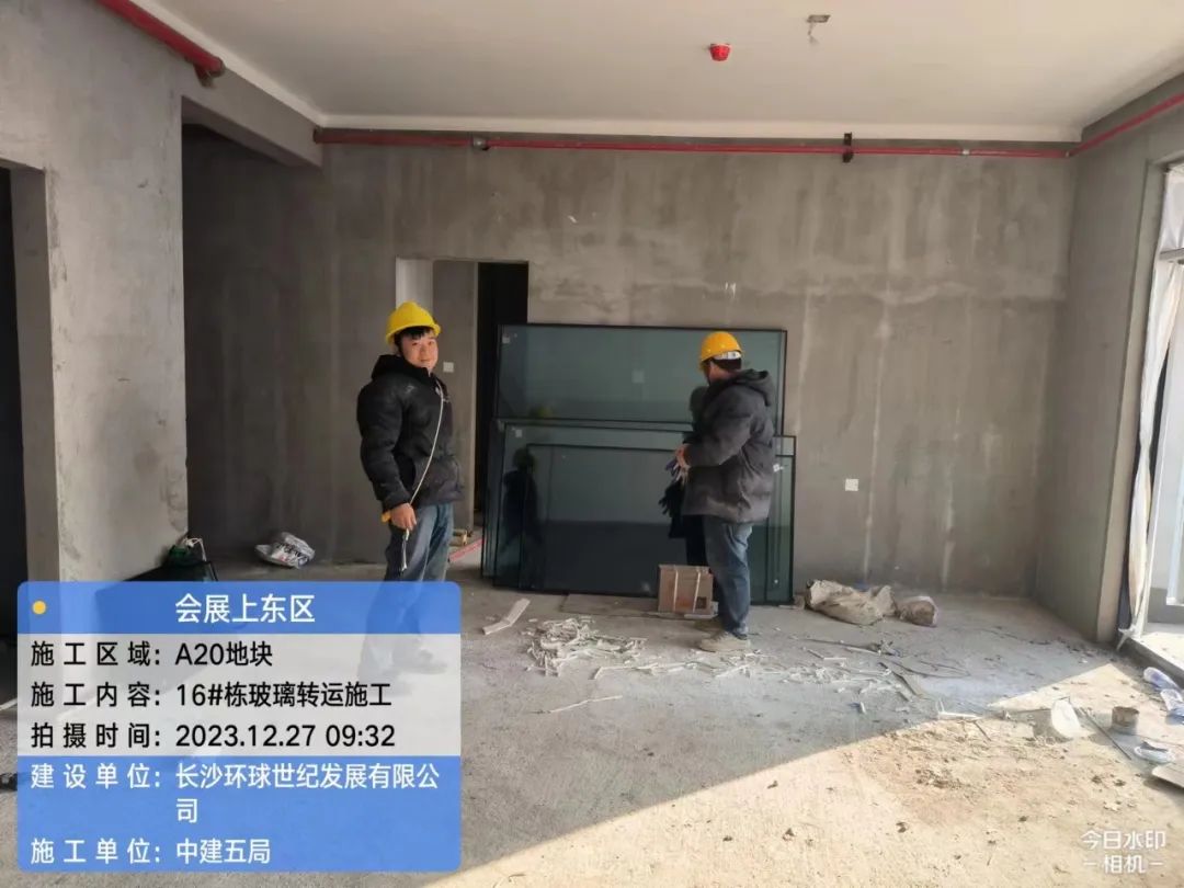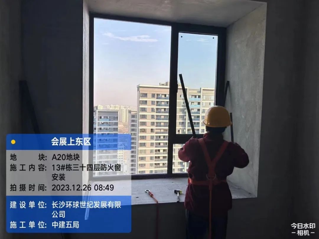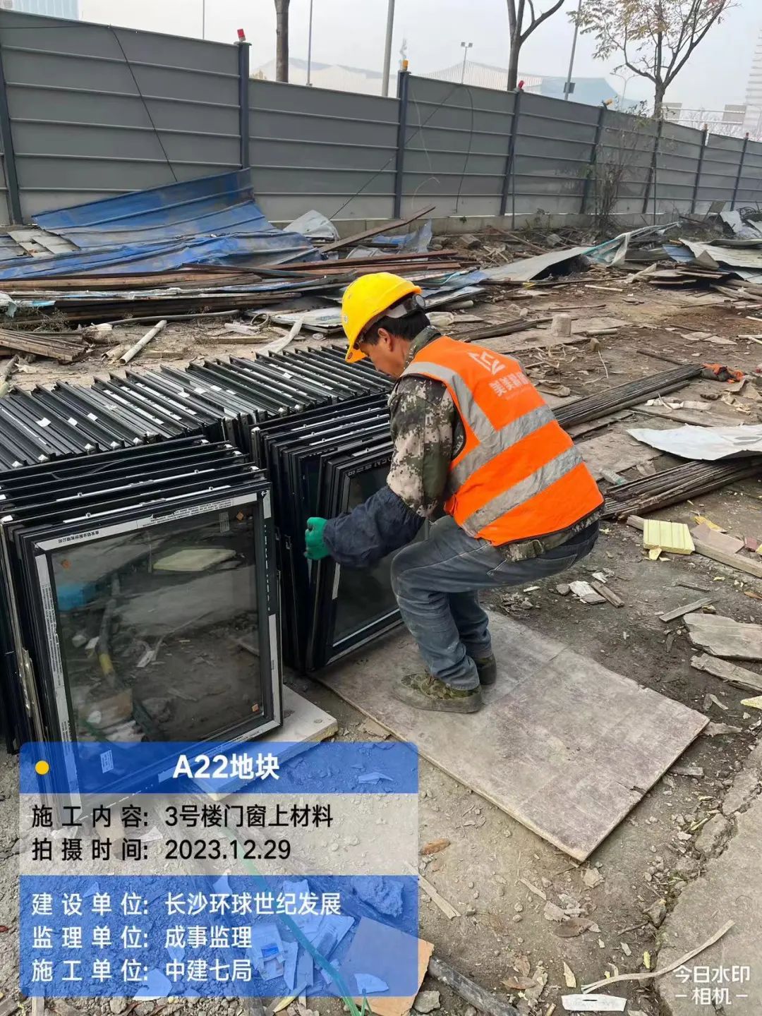 5#、7#、9#栋固定玻璃及推拉门上运材料,安装固定玻璃;防火窗、防火门扇安装。