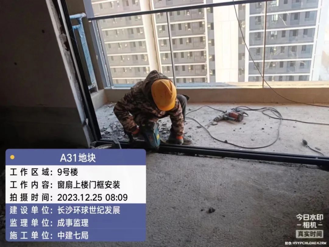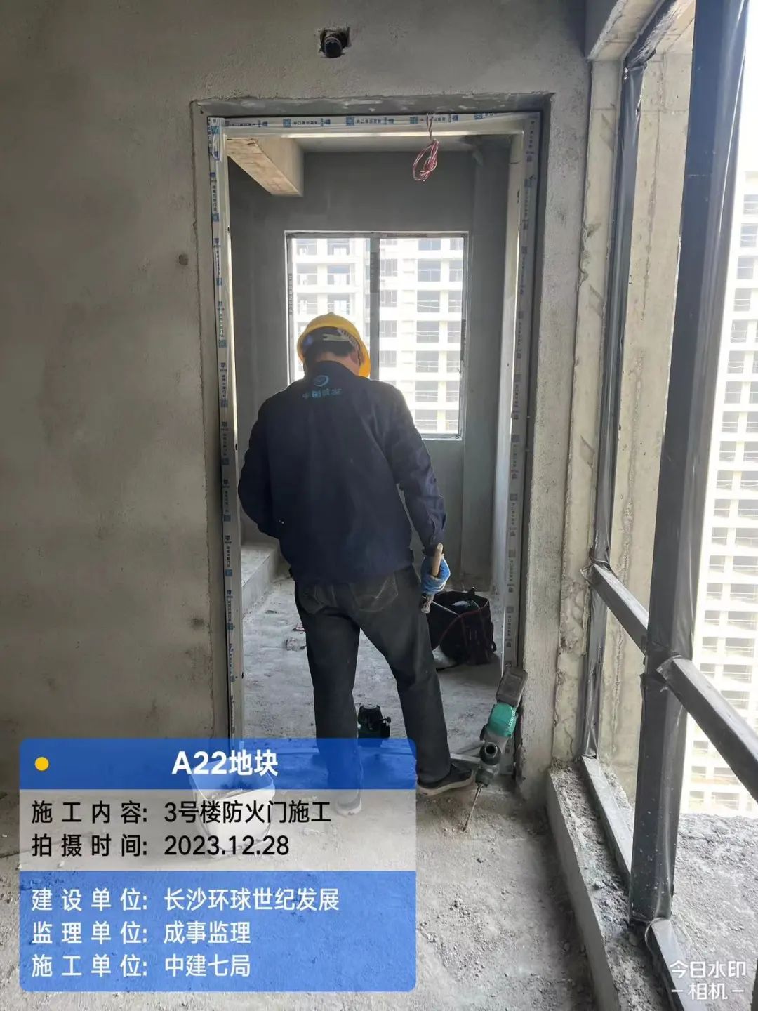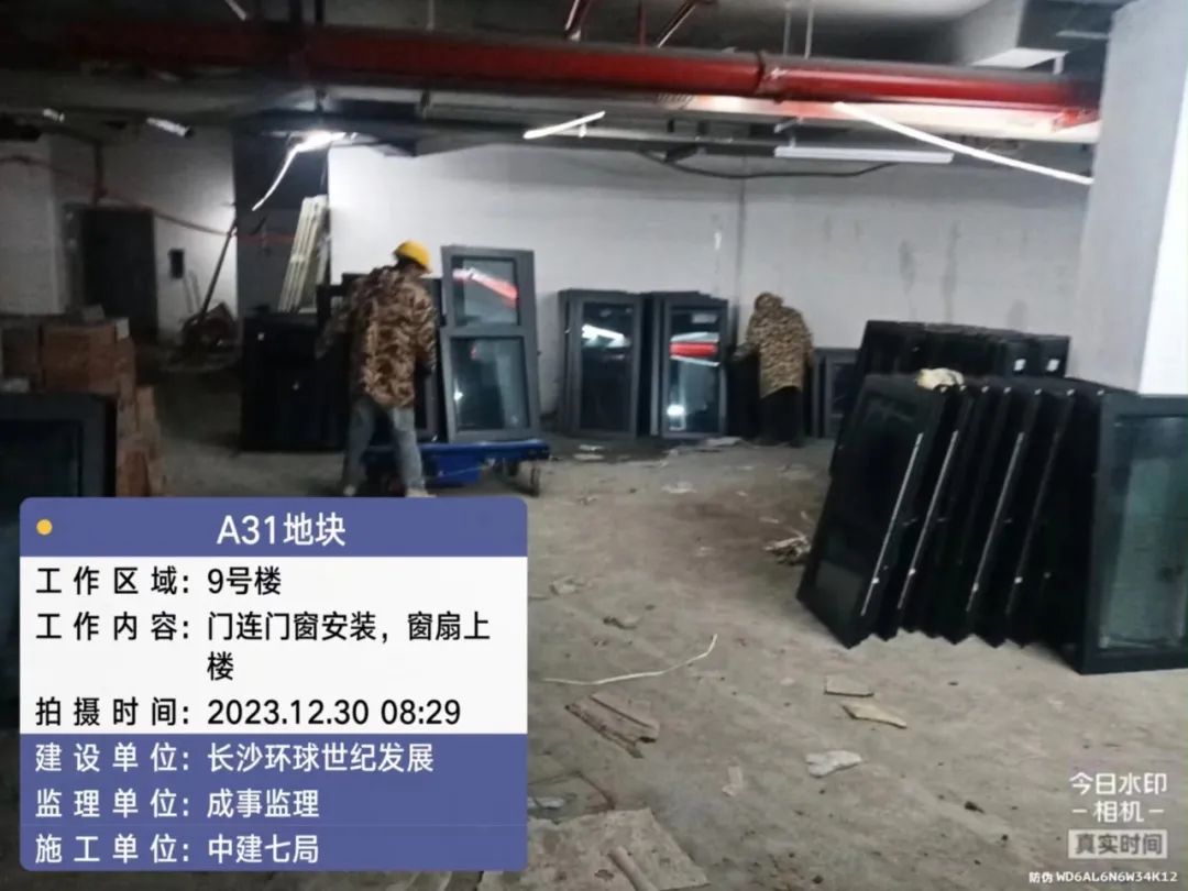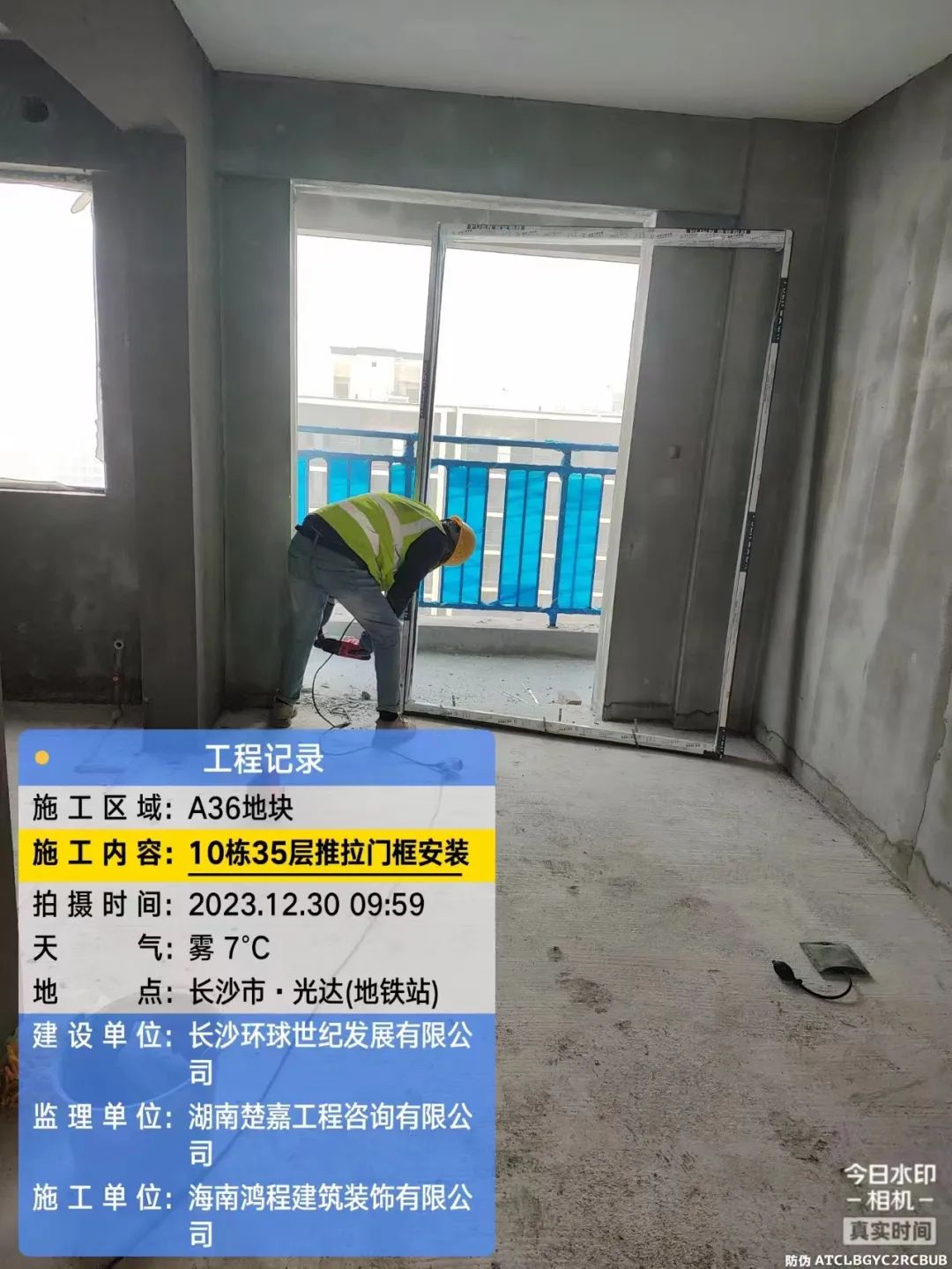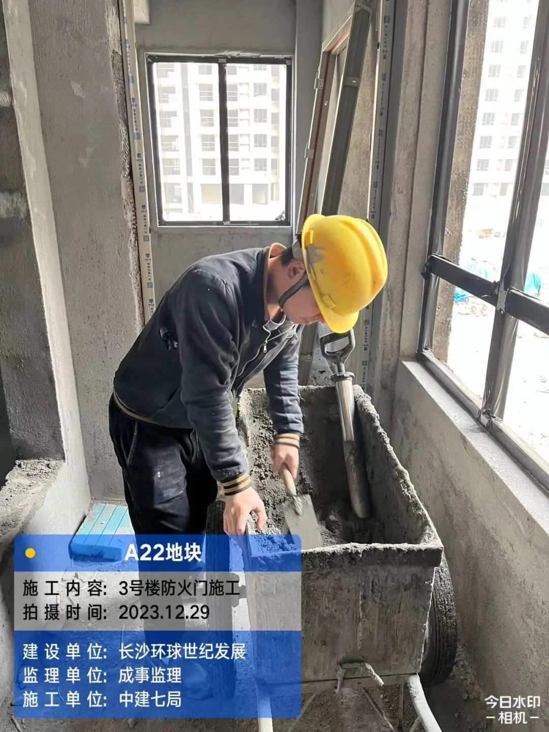 5#、7#、9#栋固定玻璃及推拉门上运材料,安装固定玻璃;防火窗、防火门扇安装。