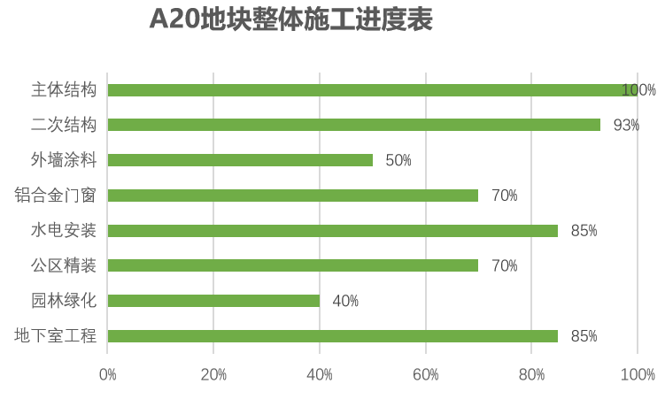 主体结构完成100%;二次结构完成93%(砌筑完成99%;抹灰完成99%;保温完成88%),铝合金门窗、栏杆完成70%;水电安装完成85%;地下室工程完成85%,公区装修完成70%,外墙涂料完成50%,园林完成40%。