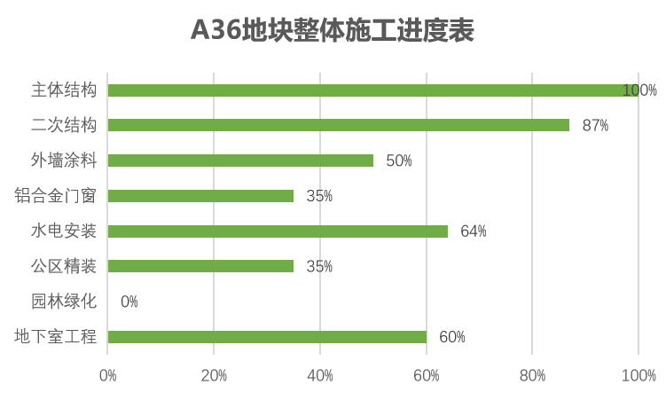 主体结构完成100%;二次结构完成87%;水电安装完成64%;锌钢栏杆百叶安装53%;地下室工程完成60%;外墙完成50%,铝合金门窗安装完成35%,公区装修完成35%。