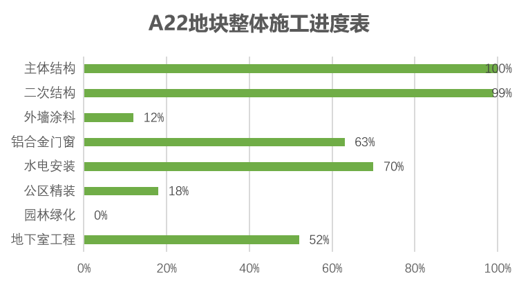 主体结构完成100%、二次结构完成99%、水电安装完成70%、地下室工程完成52%,栏杆完成20%、门窗完成63%、消防完成53%,精装完成18%,正式电梯30%,外立面12%。