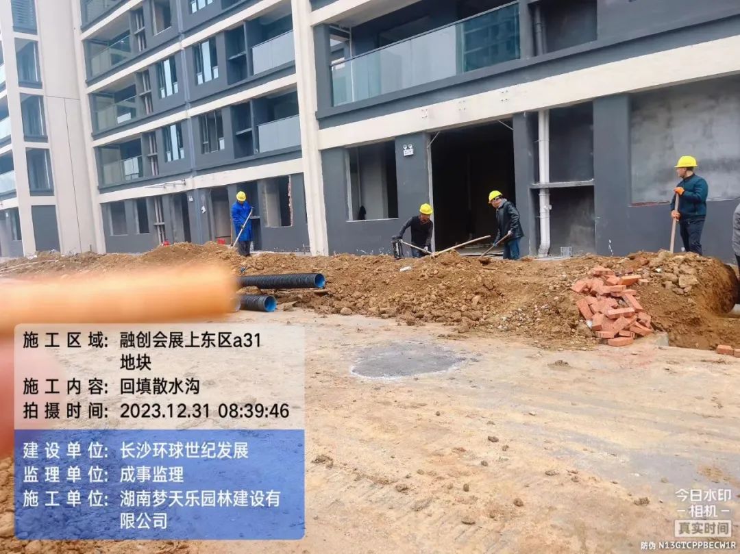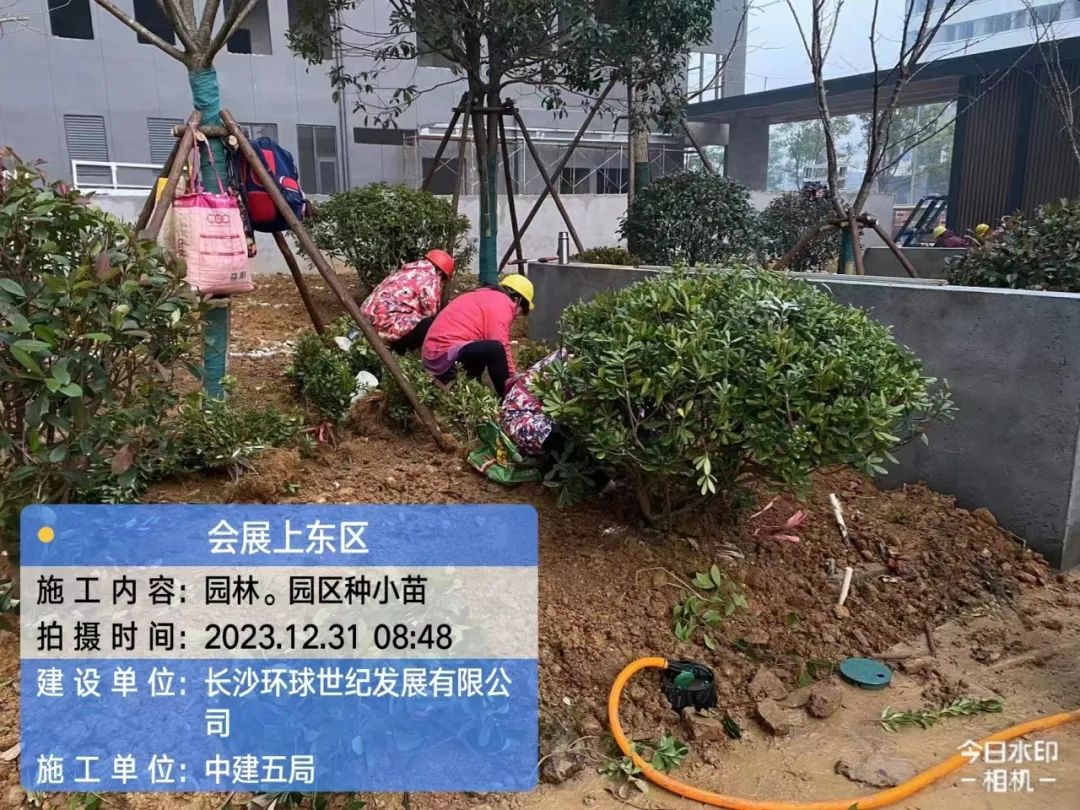 园林填土及围墙、管网施工、园区铺砖、绿植种植。