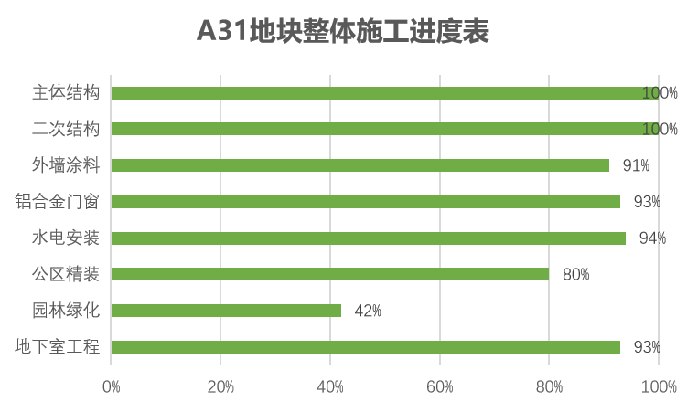 主体结构完成100%;二次结构完成100%;外墙涂料完成91%,铝合金门窗整体完成93%;水电安装完成94%;公区精装完成80%,地下室工程完成93%,园林工程42%。