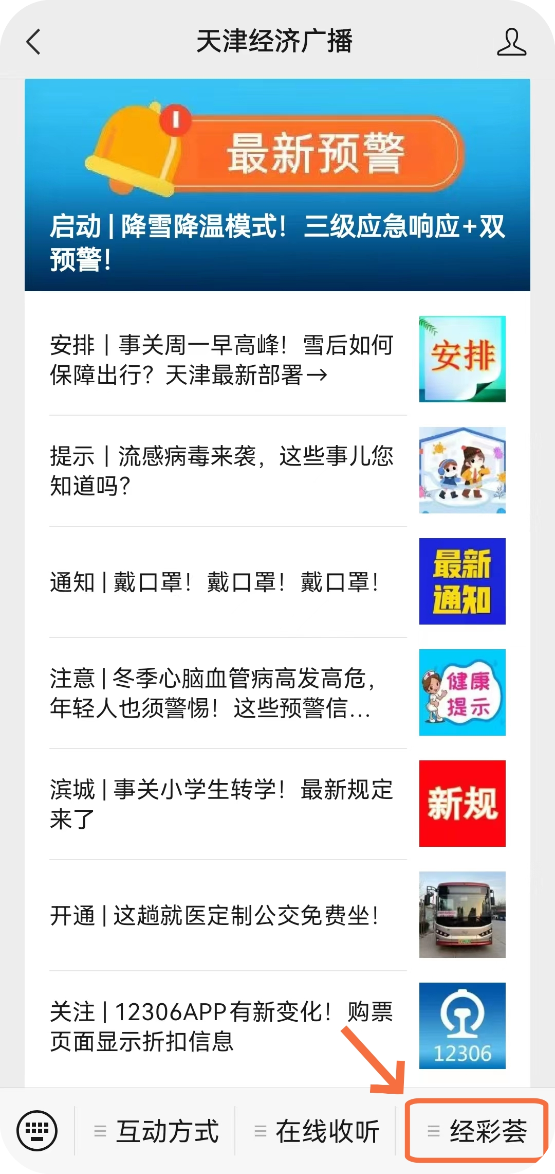 1、打开【天津经济广播】公众号主页下方菜单的【经彩荟】