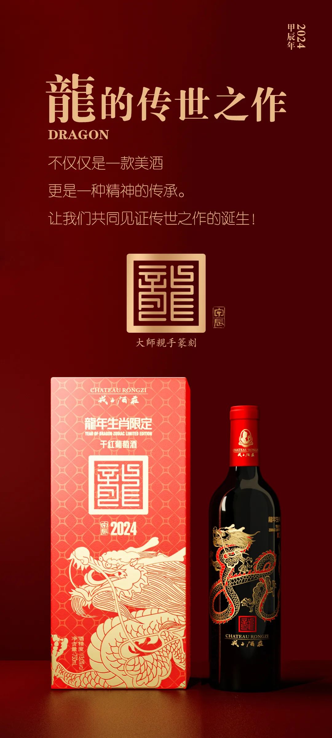 在甲辰龙年到来之际,戎子酒庄继己亥猪年、庚子鼠年、辛丑牛年、壬寅虎年、癸卯兔年连续5年发布生肖纪念酒,戎子酒庄·甲辰年“龍年生肖限定干红葡萄酒”也如期而至。