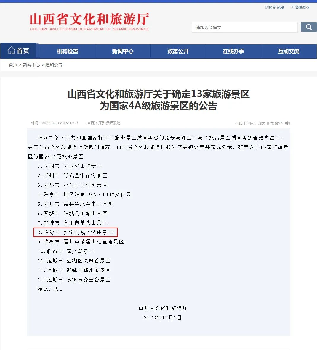 2023年12月7日,依照中华人民共和国国家标准《旅游景区质量等级的划分与评定》与《旅游景区质量等级管理办法》,经有关市文化和旅游行政部门推荐,山西省文化和旅游厅按程序组织评定并完成公示,戎子酒庄景区被评定为国家AAAA级旅游景区。