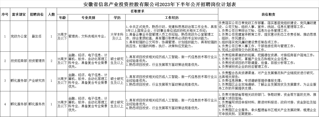 安徽省信息产业投资控股有限公司2023年公开招聘岗位计划表