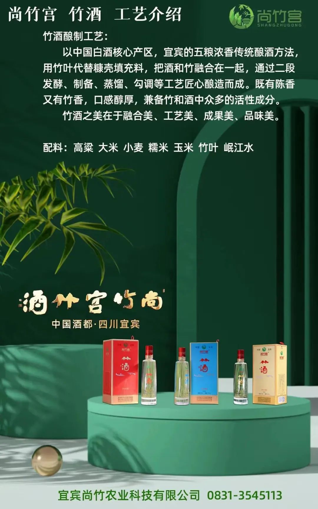 企业荣誉:1:尚竹公司在2022年1月17日申请了独家专利,专利号:202111479674.0。2:尚竹公司在2022年2月7日注册自己的商标。3:产品工艺公司在宜宾丰富的竹林资源中筛选出5种适合酿酒的竹子,采用现代生物技术和首创的两段法发酵,让5种竹子和5种粮食有机融合,历经69天的发酵得到名品佳酿,使竹酒从宜宾竹产业发展中脱颖而出,创立了五竹和五粮酿酒融合发展的新模式。