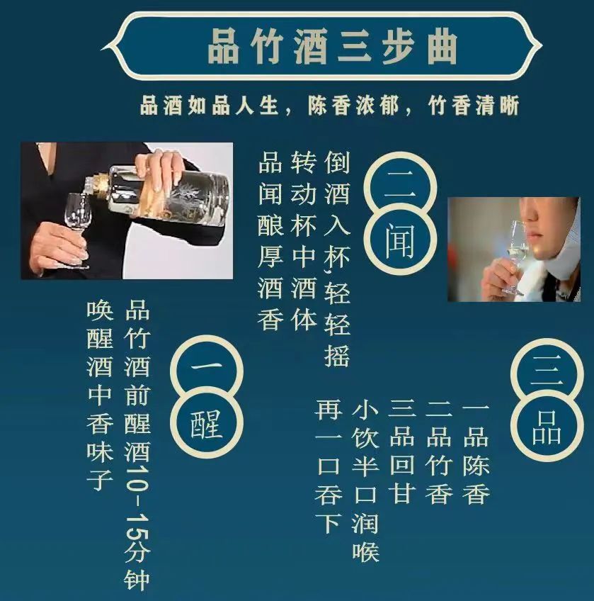 酿造工艺:以中国白酒核心产区,宜宾的五粮浓香传统酿酒方法,用竹叶代替糠壳填充料,把酒和竹融合在一起,通过二段发酵、制备、蒸馏、勾调等工艺匠心酿造而成。既有陈香又有竹香,口感醇厚,兼备竹和酒中众多的活性成分。竹酒之美在于融合美、工艺美、成果美、品味美。