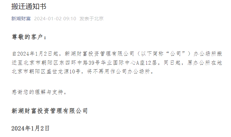 自2024年1月2日起,新湖财富投资管理有限公司(以下简称“公司”)办公场所搬迁至北京市朝阳区东四环中路39号华业国际中心A座12层。同日起,原办公所在地北京市朝阳区盛世龙源10号,将不再用作公司办公场所。