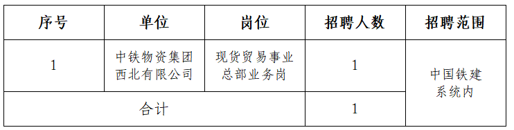 为满足中铁物资集团西北有限公司(以下简称西北公司)改革发展需要,进一步深化三项制度改革,优化人员配置,现根据业务发展需要,对西北公司现货贸易事业总部业务岗进行公开招聘。