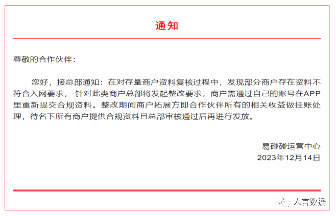聚合码牌产品易碰碰官方紧急发布整改通知: