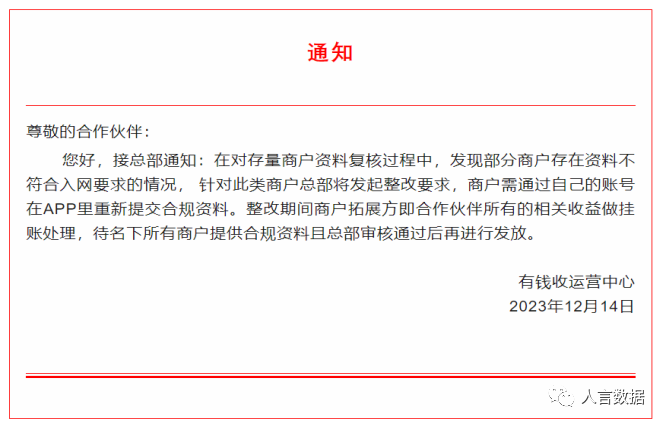 聚合码牌产品有钱收官方紧急发布整改通知: